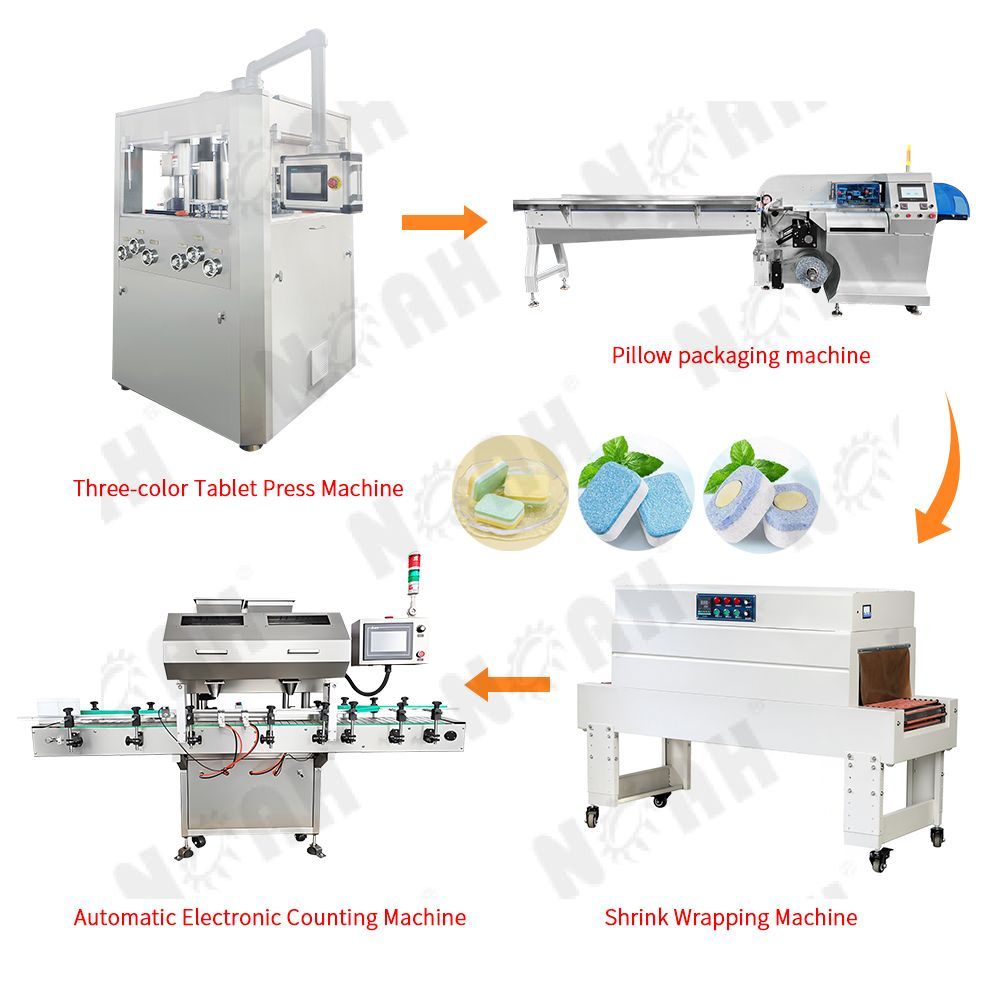 В целом данная линия по производству и упаковке таблеток для мытья посуды, оснащенная четырьмя основными единицами оборудования, реализует автоматизированное производство и упаковку таблеток для мытья посуды от прессования сырья до упаковки готовой продукции, что значительно повышает эффективность производства и качество продукции, а также сокращает ручные операции и ошибки.